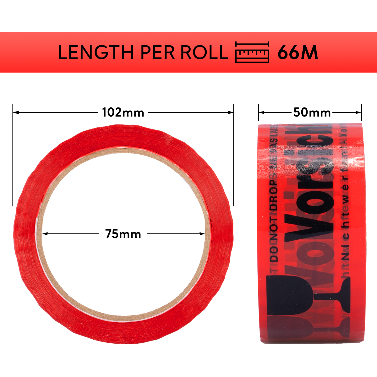 Caution: Glass tape is used for packing and sealing cardboard boxes and packaging containing fragile or sensitive goods. The bright red color of these warning tapes immediately draws attention, encouraging careful handling of the goods. These warning tapes fit all standard hand dispensers and are light- and age-resistant.