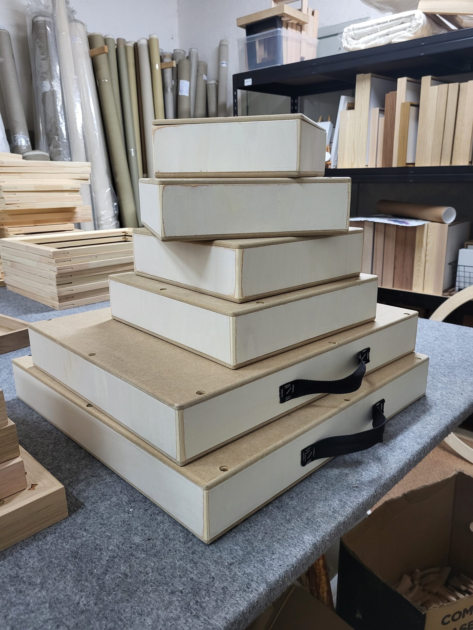 Beide Typen können nach Ihren Vorgaben gefertigt werden. Normalerweise „vergrößern“ wir die Maße des Gemäldes von jeder Seite um ca. 2 cm, um einen passgenauen Kiste zu schaffen.